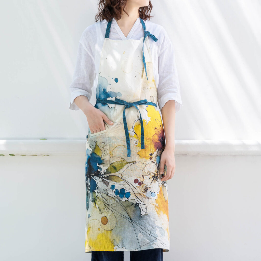 水彩画のようなタッチが印象的な、花柄プリントのエプロン。身に着けると自然と気分があがります。